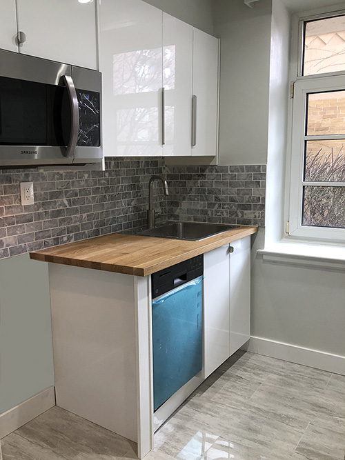 In this project, we redesigned the kitchen with floor tiles, backsplash, painting and an IKEA kitchen in Oakville. Working with our team, we recreated the dilapidated kitchen in a week.